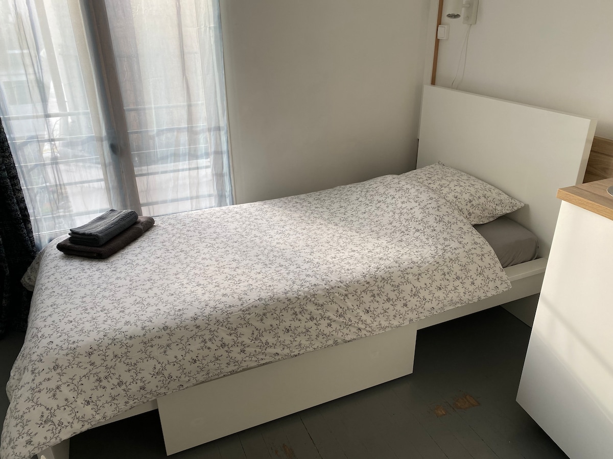 Envie d' une parenthèse en solo au coeur d'Annecy? Petit studio refait à neuf et judicieusement aménagé, bénéficie d'une terrasse ensoleillée permettant de déjeuner Il se compose d' une salle d'eau avec grande cabine de douche, d' une vasque , de toilettes (sanibroyeur) séparées par un rideau, kitchenette équipée, plaques induction, réfrigérateur, micro ondes, machine nespresso espace repas, coin penderie, lit UNE PLACE avec rangements. possibilité de louer 1 vélo. Pour UNE personne !
