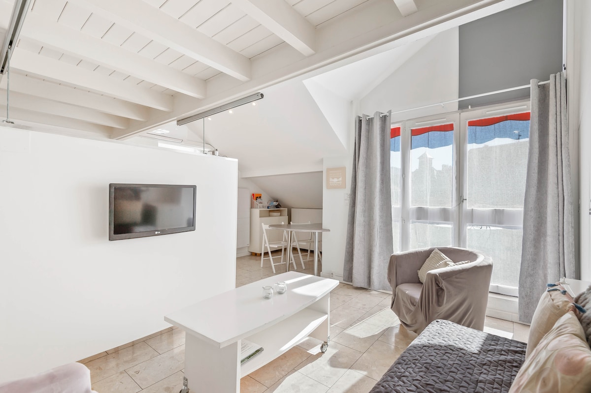 Voici l'appartement idéalement situé en plein cœur du centre ville historique avec une terrasse, au dernier étage d'un immeuble avec ascenseur. Lumineux, 40m² env, séjour avec canapé convertible, terrasse bien exposée, chambre en mezzanine, cuisine équipée avec lave vaisselle, frigo, plaque de cuisson, four micro-onde, machine à café Nespresso Salle de bains avec douche et wc séparé Machine à laver, CLIMATISATION, WIFI, fibre