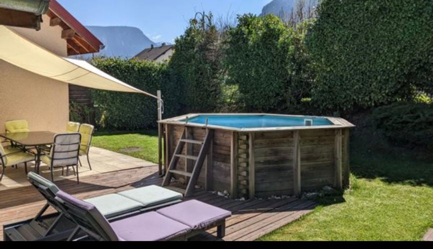 Relax in this quiet and stylish accommodation. To get to the apartment, you will have to cross the lawn for 30m then you will access the terrace of your accommodation. You access through a kitchen open to a living room and a 30m² bedroom. Separate toilet, bathroom with sink and shower. The kitchen and bathroom are equipped with French windows opening onto a terrace. You will be located 15 minutes from the lake and at the foot of numerous hiking trails. Annecy is 27km away.