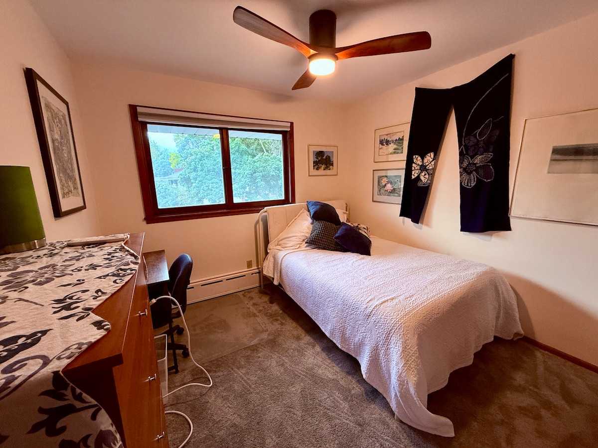 Columbia Heights: Minneapolis border, 60’s-Style home. Queen size bed, gourmet kitchen, piano, home theater & performance space. Outdoors: relaxing patio with gas grill and wok. Near Kordiak park, walking paths. Diverse, progressive community. Minutes from the Minneapolis Arts district. Easy access to shops, cafes and restaurants. Pot-luck dinners or take turns cooking meals? Must be vaccinated. Quiet hours: 11PM to 6 AM. Car is recommended. Warm and welcoming hosts and a friendly dog.