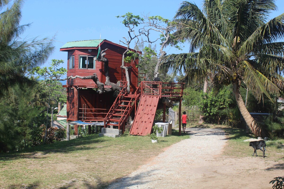 Immerse yourself in a one-of-a-kind experience in treehouse named in honor of the great-uncle who planted the tree it stands in. Upstairs, you'll find a cozy double bed with a mosquito net and a small loft with a single bed. Downstairs offers the convenience of a real flush toilet and a hot water shower, ensuring comfort in a playful setting. Centrally located, it offers Wi-Fi, fresh linens, and towels. Café Bar Colorado, and Voky Be Tours are conveniently located onsite.