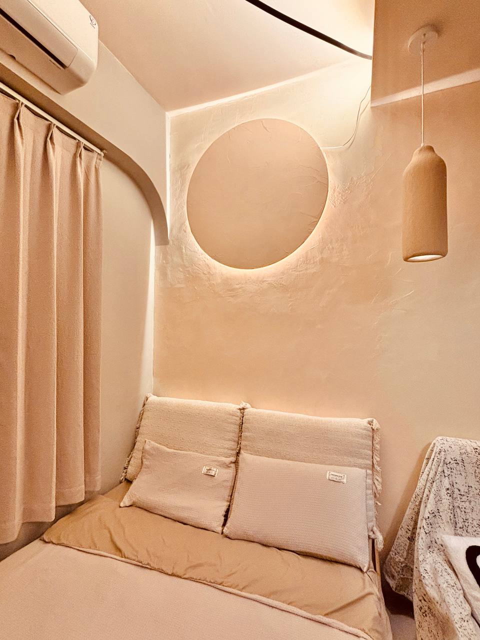結合臥室、客廳的開放式空間。 特色水管牆營造工業浪漫氛圍, 白天是設計展間,夜晚是溫馨臥房。 可彈性加床為四人房,附廚房與衛浴, 暖光、木地板讓旅程更放鬆。