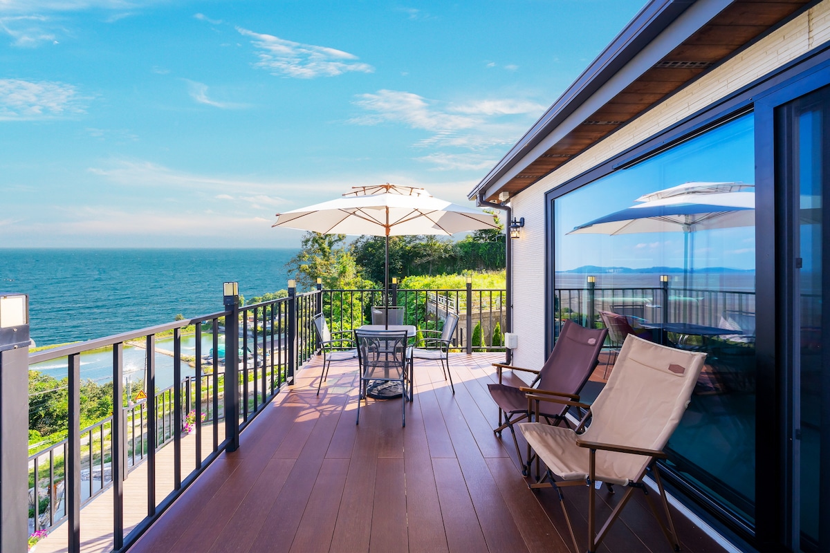 전망 좋은 바닷가 언덕 위 미술관 닮은 단독 별장입니다. 고급 지며 세련됐습니다. 230평 대지에 본 채 외 부속 편의 시설인 건물 3동 포함 80평의 공간입니다. 최고급 자재로 정갈하게 지어진 TV속 보던 별장 식 펜션 입니다. 언제나 청결한 흰색 침구와 화장실은 기본이며 본체 외 넓은 정원과 수영장, 카페겸 식당, 유리 온실 같은 바베큐장이 준비 되어 있고 별도의 비용 지불 시 독립 공간인 뜨끈한 구들동이 있습니다. 이곳은 장작을 지펴 구들을 뜨겁게 데우는 준 한옥식 별채입니다 옥상은 넓고 바다를 품을 수 있게 탁 트여 있습니다.걸어 5분 거리에 예쁘고 한적한 해변이 있고 물이 빠지면 조개잡이 체험 가능합니다. 본체 거실엔 최고급 벽난로가 준비되어 있어 환상적인 불꽃을 보실 수 있고 카페에도 작은 벽난로가 설치되어 밤새 불멍을 즐기실 수 있습니다 내, 외부에는 12이상 즐기실 수 있는 바베큐장과 모닥불을 지피실 수 있는 넓은 정원이 있습니다