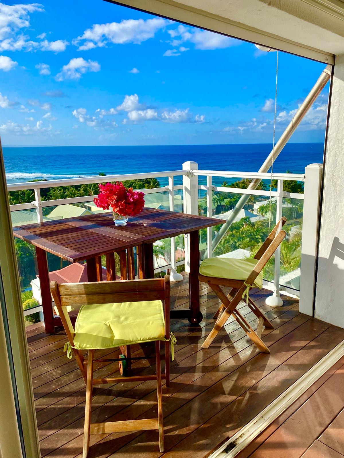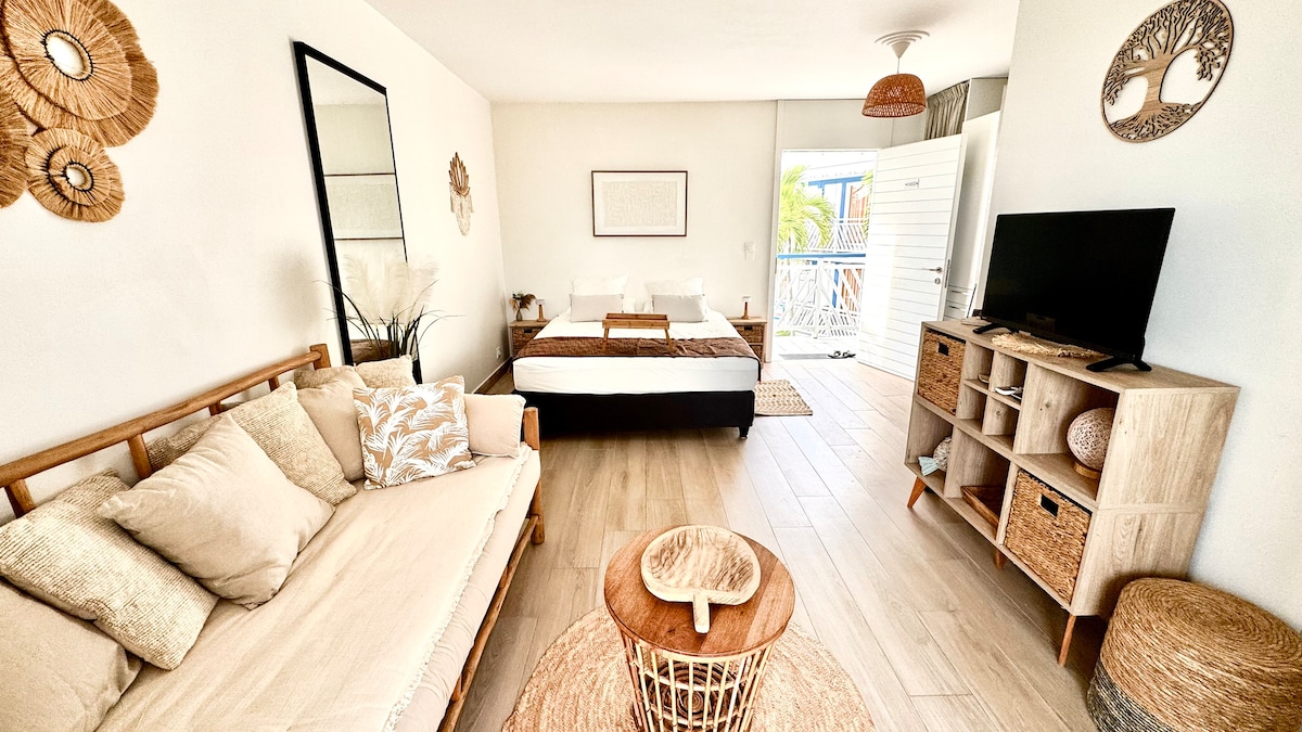 Bienvenue au Studio Sucre de Canne ! Votre refuge paisible en Guadeloupe. Situé dans une résidence calme, notre logement vous plonge dans le charme de l'île, bercé par les vagues. À quelques mètres de sa plage privée, c'est le havre de paix idéal pour un séjour inoubliable. Profitez d'une vue spectaculaire sur la mer et Marie-Galante depuis votre balcon, parfait pour des petits déjeuners et repas face à l'océan.