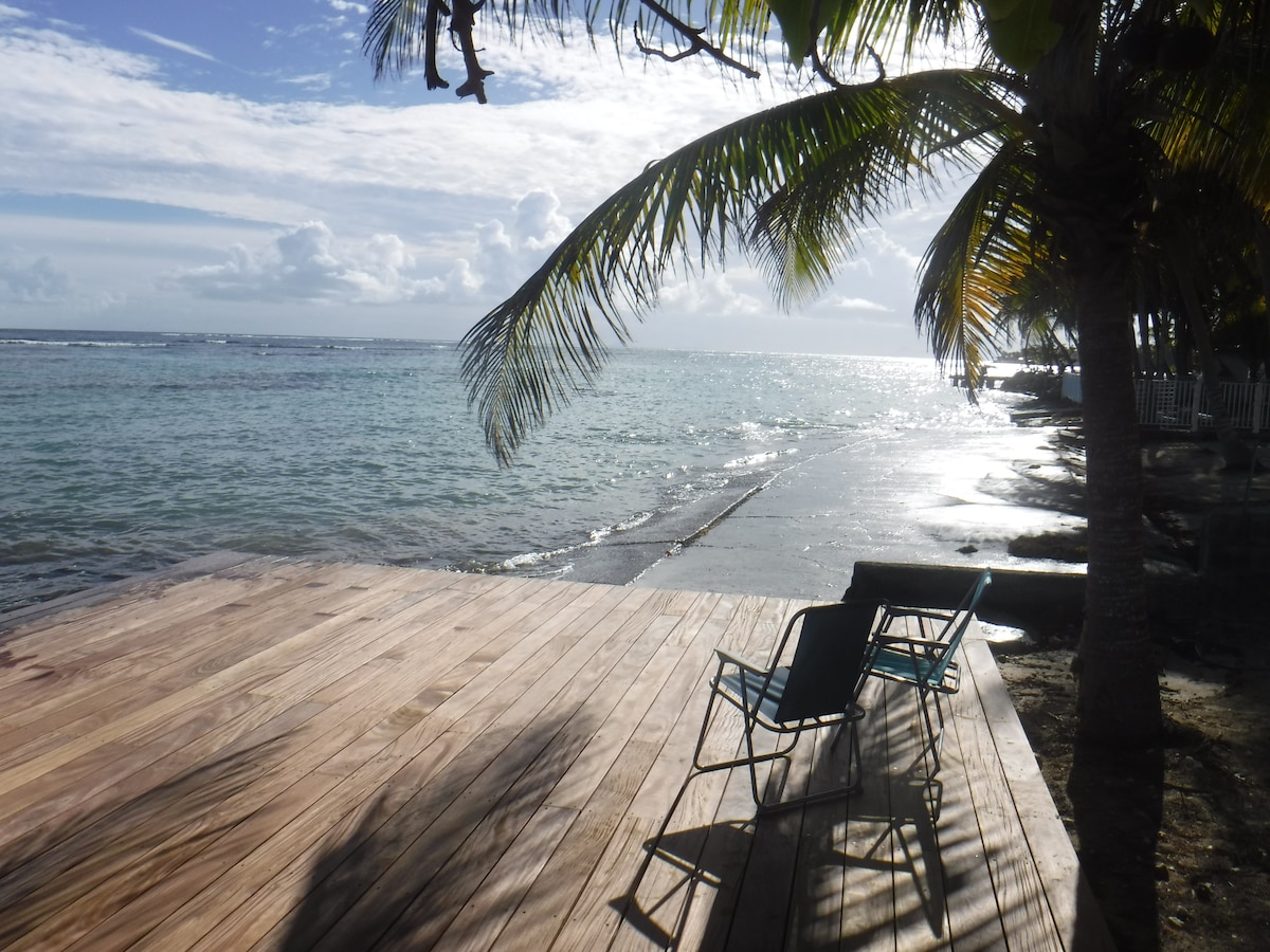 Grand studio de 30 M2, entièrement rénové, climatisé avec une grande terrasse couverte (25 M2). Vous avez une place de parking sur la propriété. L'accès à la plage du Helleux est à 150m. A 10 minutes à pied, vous pouvez rejoindre la plage de Pierre et Vacances avec une vue magnifique sur Marie-Galante ou la plage de carte postale de Bois-Jolan. Les draps et serviettes de toilette sont fournis.