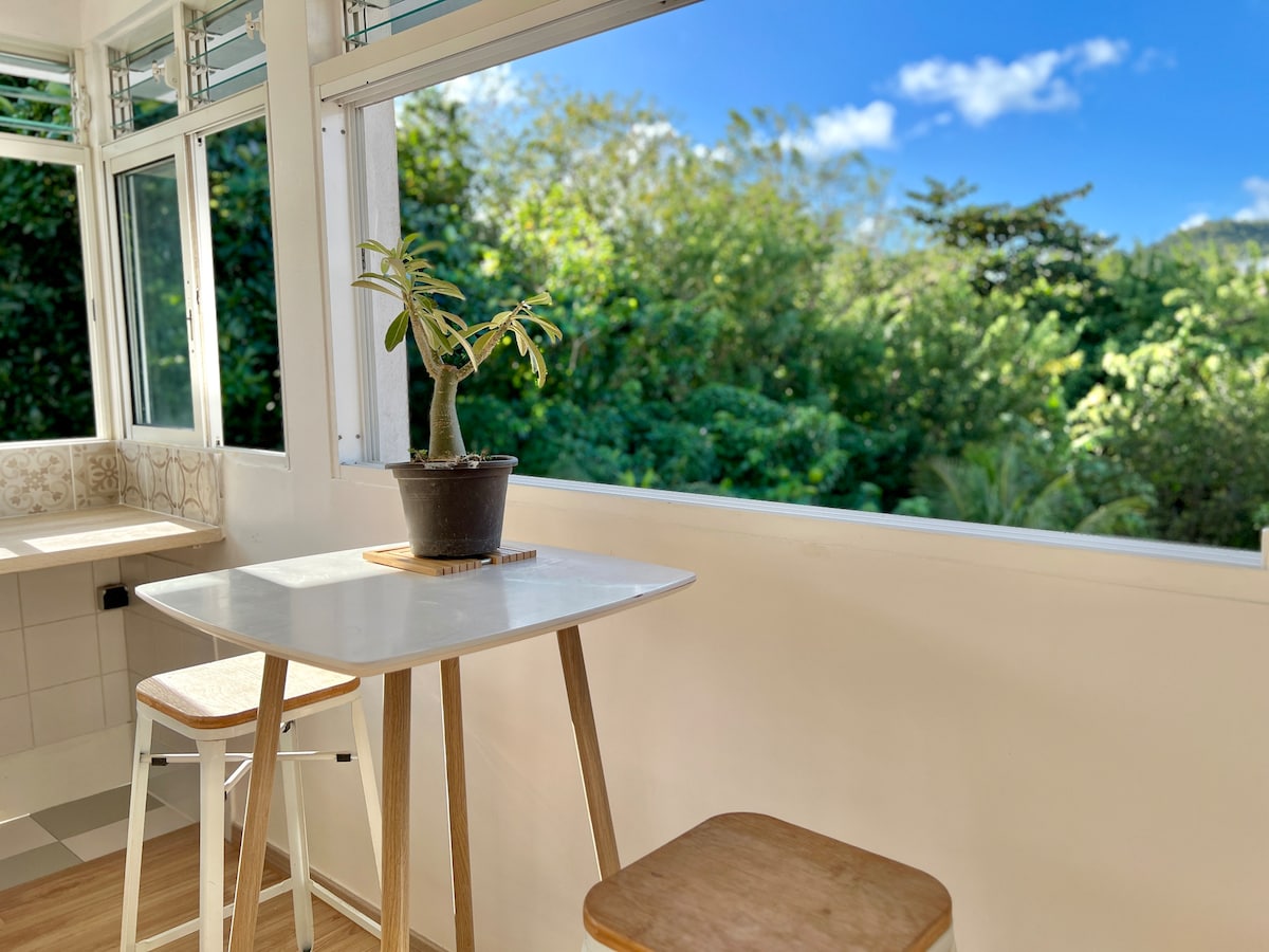 Studio avec vue mer cadre verdoyant près plage