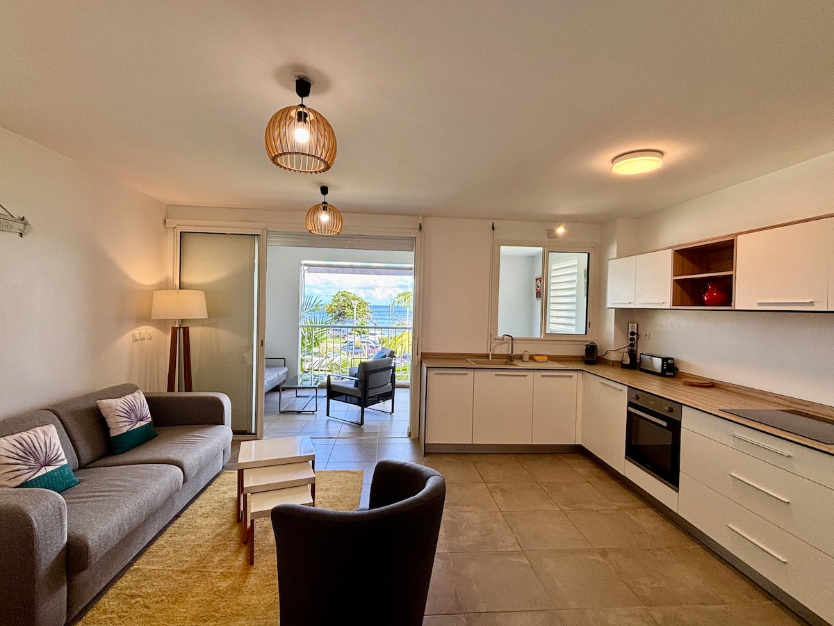 Appartement 2 étoiles, avec vue dégagée situé à 2 min à pieds de la plage de l'Anse l'Etang. Au dernier étage d'un immeuble, ce T2 vous apportera confort et tranquillité. Il est composé d'une chambre climatisée avec lit confortable et armoire de rangements, une salle d'eau avec douche à l'italienne et machine à laver, un séjour avec canapé-lit(2e couchage) et TV, une mezzanine, une cuisine équipée ouverte sur le séjour, une terrasse avec table et chaises et une place de parking sécurisée.