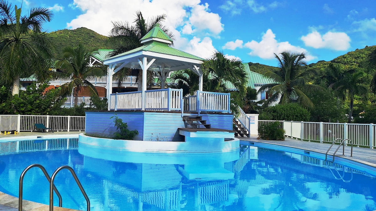 The apartment is located on the first floor of a residence in the heart of the bay of Anse Marcel overlooking the beach and the marine park of Saint-Martin. An apartment completely renovated in 2020, fully equipped,air conditioned, bright, with a patio overlooking one of the 3 swimming pools of the residence, and views of the hills and the landscaped park bordering the small pond of Anse Marcel.