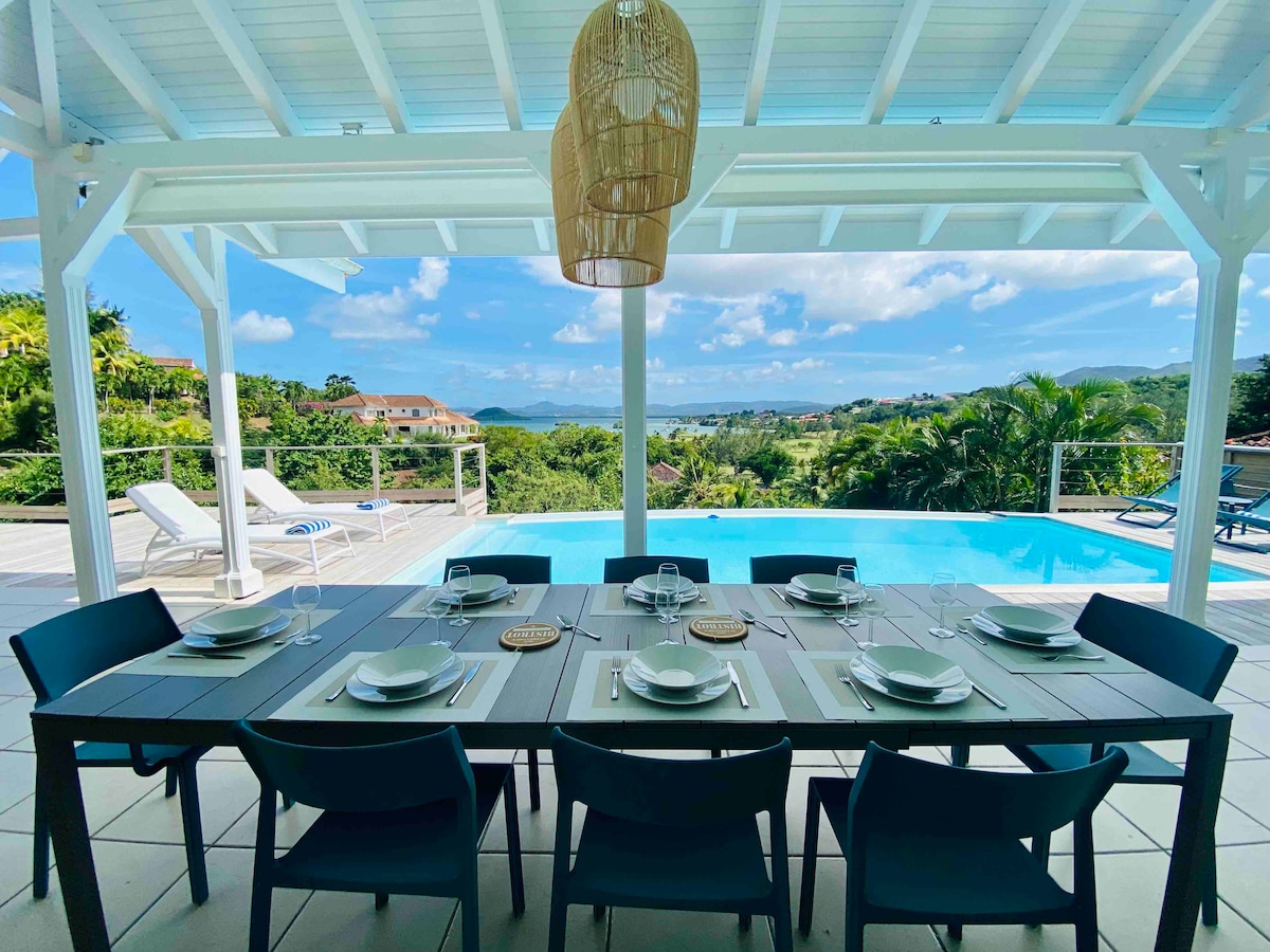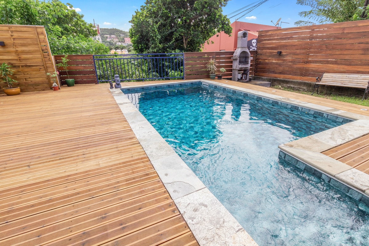 Magnifique vue sur la mer des Caraïbes ! Très belle villa, calme et reposante, située dans une résidence dès plus prisées, qui surplombe la grande baie. Les réveils sont lumineux et les couchers de soleil sont à couper le souffle. Le premier bain de mer à 4 mn en voiture. La villa est aménagée avec goût, des matériaux de qualité et totalement équipée. Piscine au sel. Jardin. BBQ. Localisation idéale pour rayonner partout sur l'île. Parking privé sécurisé pour 2 voitures. Supermarché à 5 minutes.