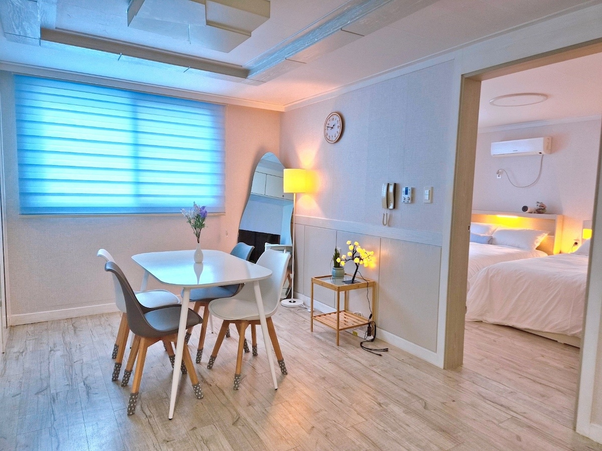 Our Happy Place is a cozy and cozy space with a cozy feeling. It is a 2-minute walk from Pyeongtaek Station, so transportation is easy, and there are many restaurants/cafes nearby, so there are many things to enjoy. It is good for relaxing and dining by dividing the bedroom and dining area, and basic cooking tools, disposable toiletries, towels and dryers are available. I hope you have a comfortable day with your lover and friends. Free parking (may be no space in the parking lot at night)