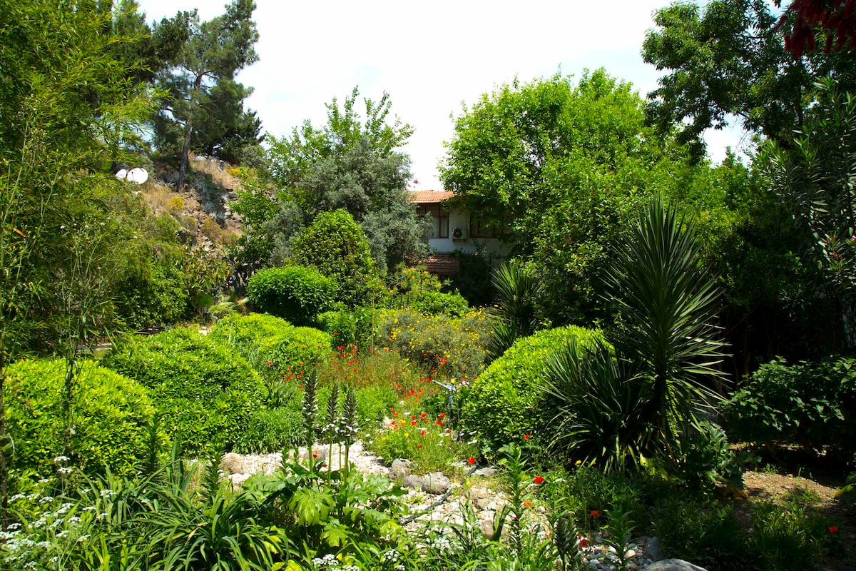 A beautiful room in a a charming house inside a 4,500 sqm. large mediterranean garden with orange and lemon trees. The room has a small balcony and is nicely decorated with local unique furniture. Included in the room price is a nice breakfast.