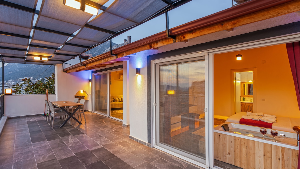 Amazing penthouse in the peaceful center of Kaş, Likya St. The large roof (35m2) is facing up to Kaş Port and Megisti (Kastelorizo) island, backing down to Lycian rock-cut tombs. 80 m2 fully furnished with cedarwood, quality fixtures and fittings.