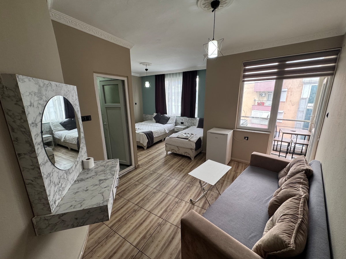 Şehir merkezinin kalbinde, aileler için ideal bir konaklama sunan bu stüdyo daire, modern tasarımıyla öne çıkıyor. Geniş balkonu, doğalgazlı ısınma sistemi ve tam donanımlı mutfağı (tencere, tava, tabak, çatal dahil) ile rahat bir ev atmosferi sağlıyor. 7/24 resepsiyon hizmetimiz ve apartman dışındaki güvenlik kameraları, güvenli ve sorunsuz bir konaklama deneyimi sunuyor. Şehir merkezinde ailenizle rahatça vakit geçirebileceğiniz mükemmel bir seçim!