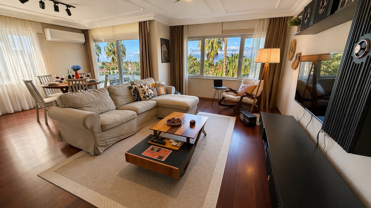 120 m2 modern, comfortable, luxurious apartment in the city center, equipped with all amenities. It offers views of the Old Town, the sea, and the Taurus Mountains. It's a 3-minute walk to the Old Town, a 10-minute walk to the marina, and a 10-minute walk to Mermerli Beach. Tram and bus stops are nearby. It's 100 meters from Hadrian's Gate, the entrance to the Old Town. It's 50 meters from the nostalgic tram stop. The metro station leading to the airport is 400 meters away.