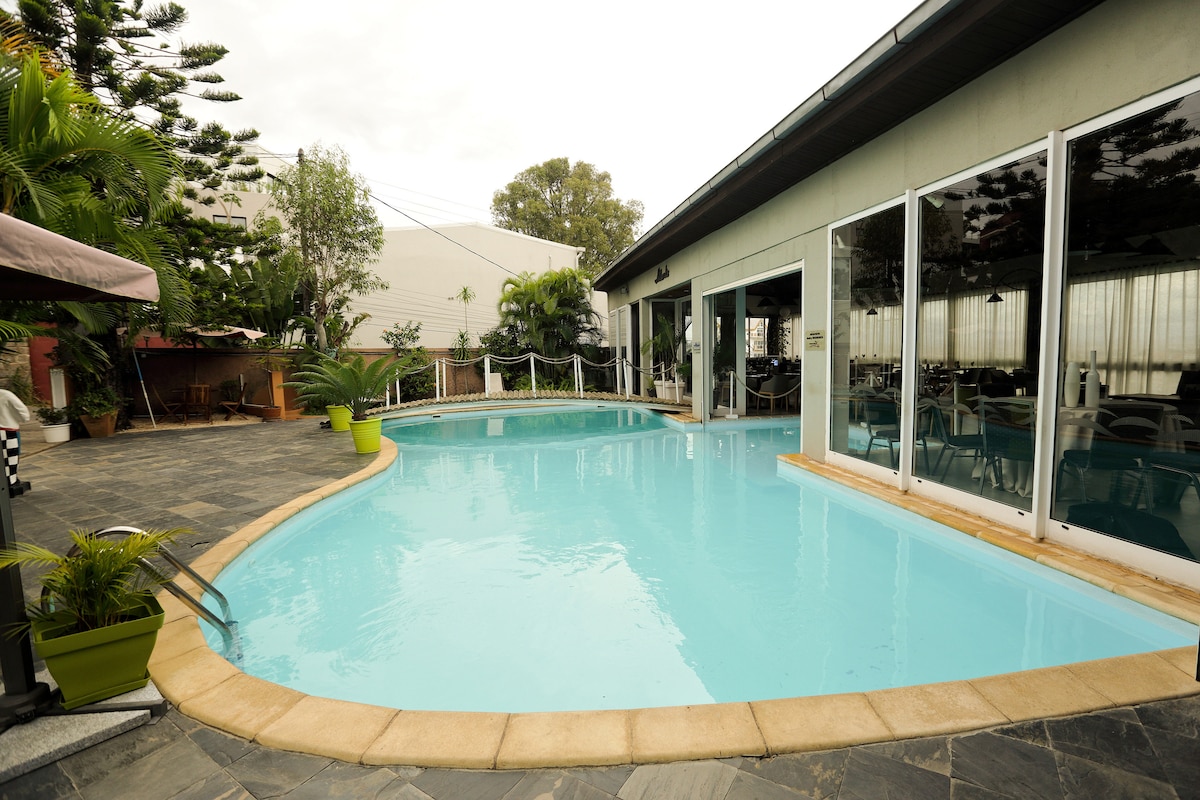 Bonjour, Un bon appart'hôtel qui permet de cuisiner, et en même temps situé en plein centre d'Antananarivo. Bâtiment totalement sécurisé, et les réceptionnistes feront un plaisir de vous assister pendant votre voyage.Petit-déjeuner, salon de coiffure, salle de réunion...tout est réuni pour vous offrir un séjour au top!