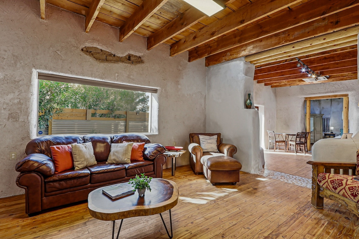Pueblo Style home on 1+ Acre with Pool! This charming 4BR/2BA Pueblo Style home features stunning details throughout. Gorgeous saltillo tile in the living areas with beautiful wood beam accents, and a kiva-style fireplace for cozy winter nights. The primary suite offers direct access to the covered patio for summer dips in the pool and evening Sunsets. The 4th bedroom is huge and could be used as a second living area. The pool is not heated but will be open and cleaned all year. Sorry no pets.