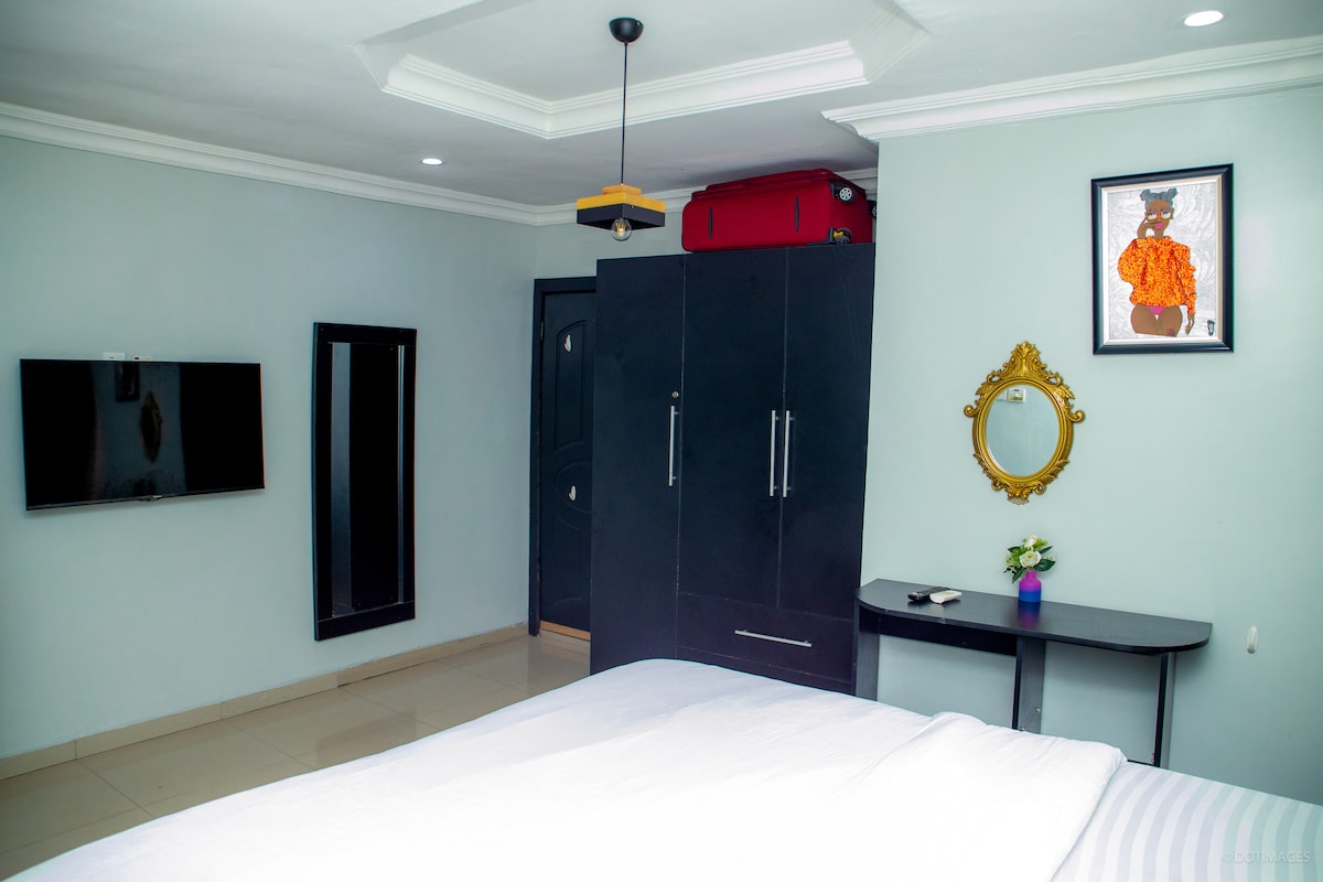 This unique place has its own distinctive style. The standard en-suite room features a semi- orthopedic super king - size comfortable mattress and modern bathroom with water heater. Unlimited super fast 5G Wi-Fi, 43 inches Smart Tv in the room and 55 inches Smart Tv in the sitting room. Netflix, YouTube, DSTV, Smoke alarm, Cctv, 24/7 electricity (Band A) two 50 kva back up generator. Maximum security with security personnel on ground 24/7, 10min to International Airport and Domestic Airports.