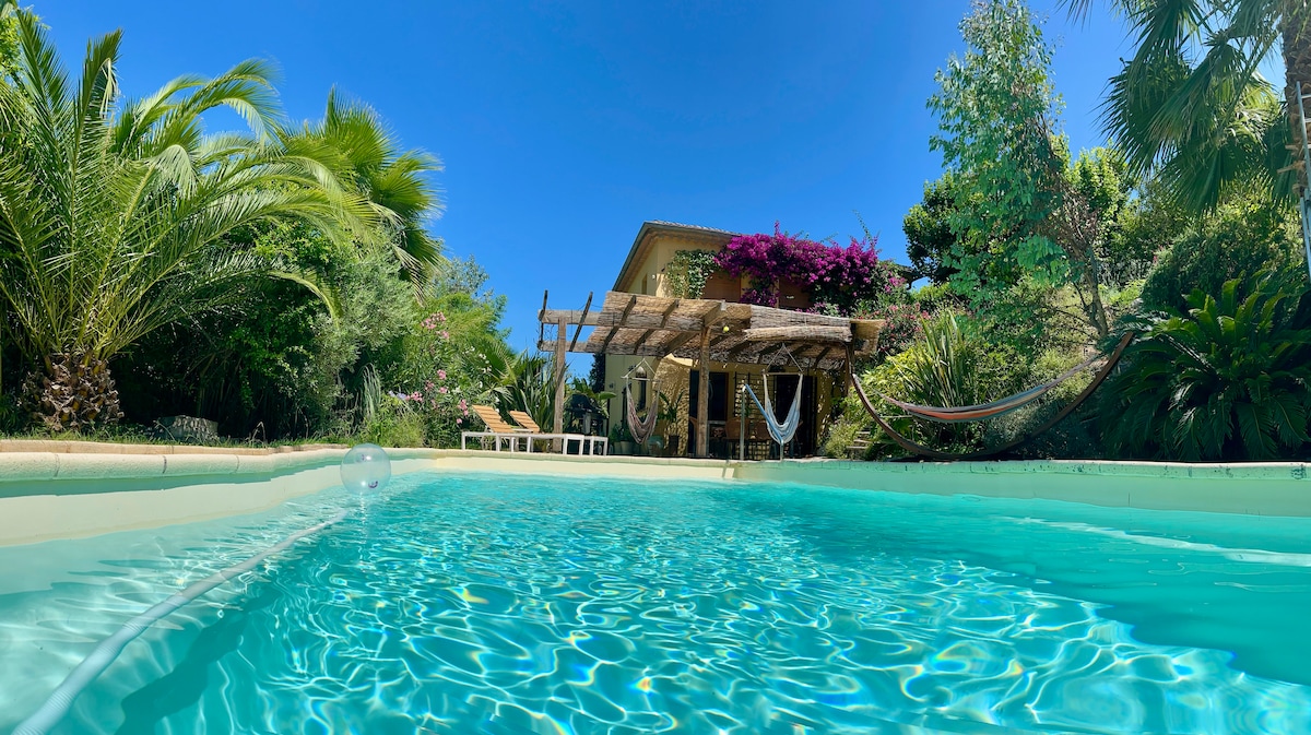 "La Hulotte" est une atypique maison mitoyenne en bois sur pilotis avec terrasse de 16m². Elle est exposée plein sud, située dans un beau jardin méditerranéen de 2000m² clos, complanté d'oliviers millénaires, avec une cabane perchée dans l'un des oliviers, une piscine partagée (hôtes et voyageurs). Elle comprend un salon avec une cuisine équipée, une salle de bain avec douche à l'italienne et deux chambres, l'une avec un lit double (140) et la deuxième un lit double (155), ou 2 lits simples.