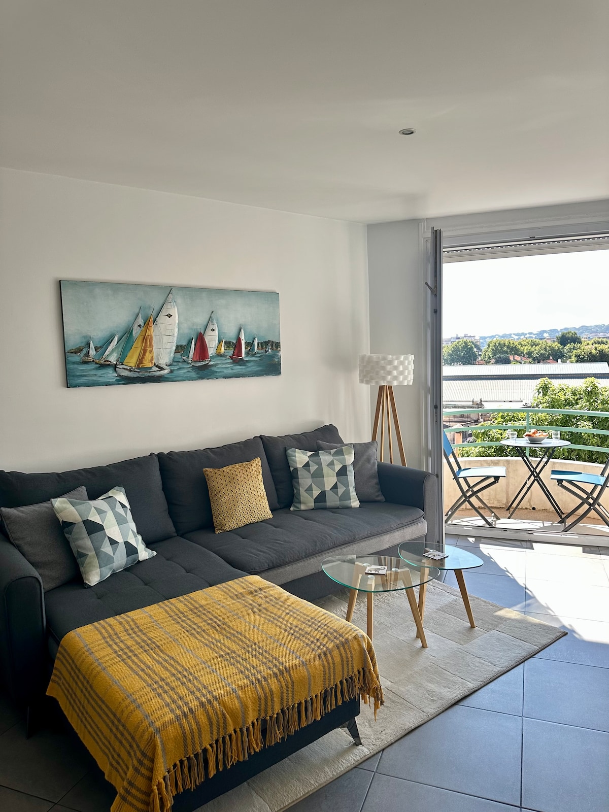 Magnifique duplex de 70m2 avec terrasse de 14m2 aux portes de la vieille ville à 5 min à pieds de la plage. L’appartement dispose de 2 chambres et 2 salle de bain en suite, une magnifique cuisine, ainsi qu’un salon et un Wc séparé. L’appartement se trouve au 1er étage sans ascenseurs dans un petit immeuble. Les places de parking autour sont gratuite de 12h à 14h et de 18h à 9h ainsi que les week-ends et jour férié.