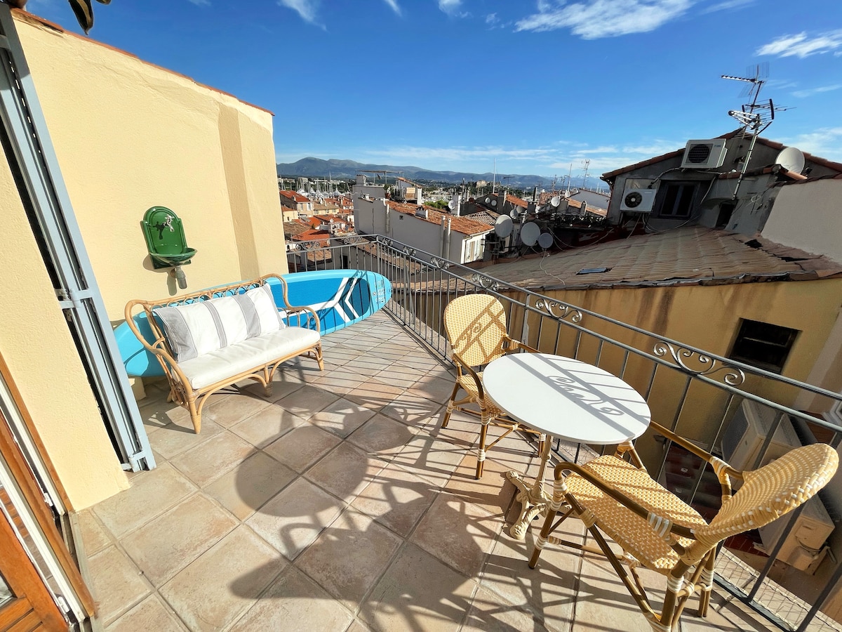 Appartement au charme provençal pour un séjour inoubliable à Antibes ! Idéalement situé au pied du marché Provençal, à 200 m de la plage de la Gravette et du Port Vauban. Une terrasse unique et très rare dans la vieille ville, avec une vue sur le Fort Carré, le Port et la mer. -- Apartment with Provencal charm for an unforgettable stay in Antibes! Ideally located at 200m from the Provencal market, the Gravette beach and the Port Vauban. A unique and very rare terrace with a magnificent view.