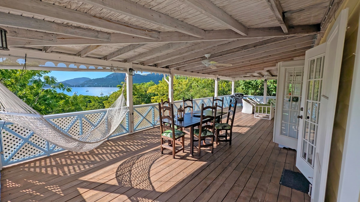 COVID 19 APPROVED Renovated Studio in quiet area, secluded, very private, but close to the action. Very breezy. Open plan kitchen, living, dining and bedroom, bathroom with walk in rain shower. Kitchen has solid concrete counter tops, new stove and large fridge plus all amenities, large ceiling fan. Private outside deck/living room with great view of the Marinas and Falmouth. Situated at Cobbs Cross within walking distance of English Harbour and the Marinas. Suitable for 1 or 2 people.