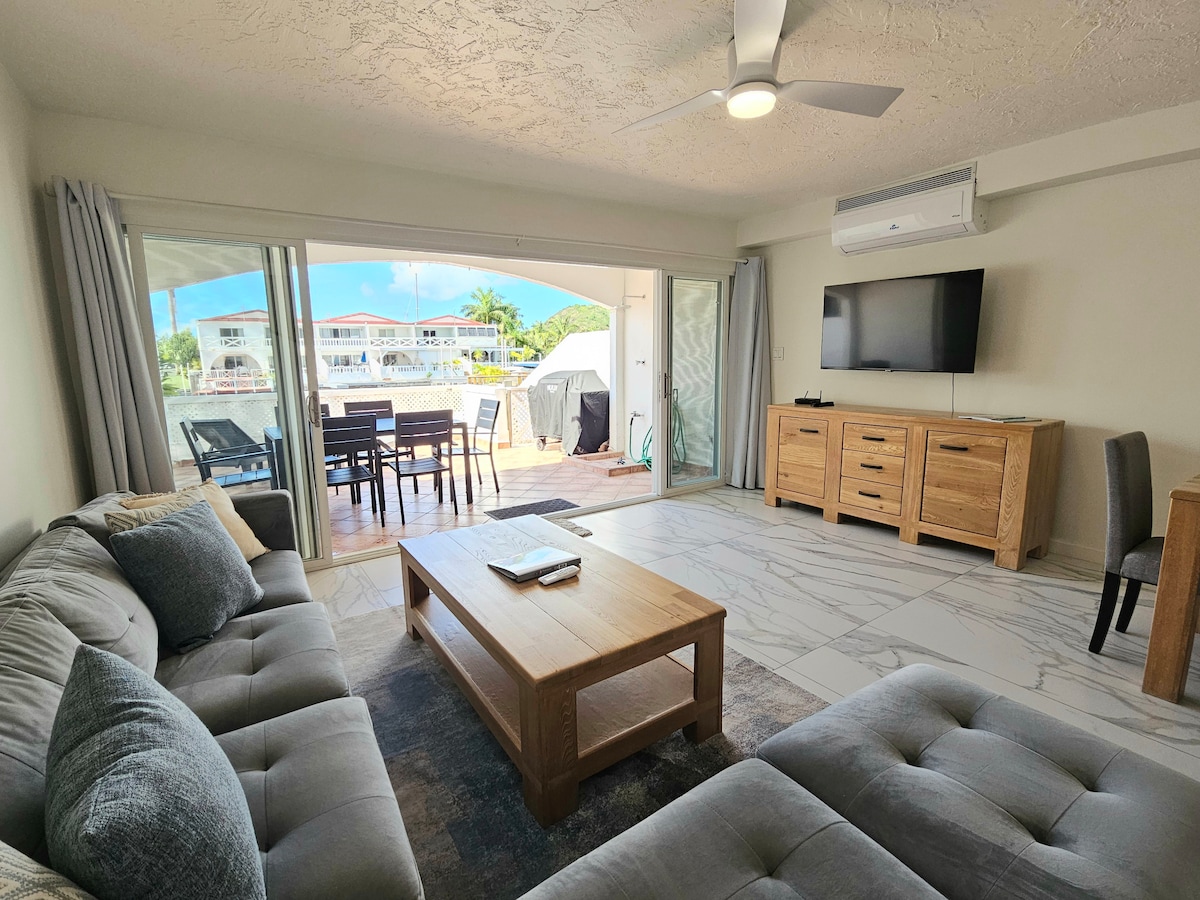 Modern Waterfront Villa with a Unique Sunset Facing View Experience ultimate relaxation in our modern south-facing villa in Jolly Harbour. With a unique, unobstructed harbour view, ample natural light, and luxurious amenities, this space is perfect for a peaceful getaway. Enjoy a fully-equipped kitchen, wine fridge, breakfast bar, cozy living room with a 50” TV, and a spacious deck with a new Weber BBQ. Your perfect Antiguan escape awaits—this is a brand new listing as of February 2025.