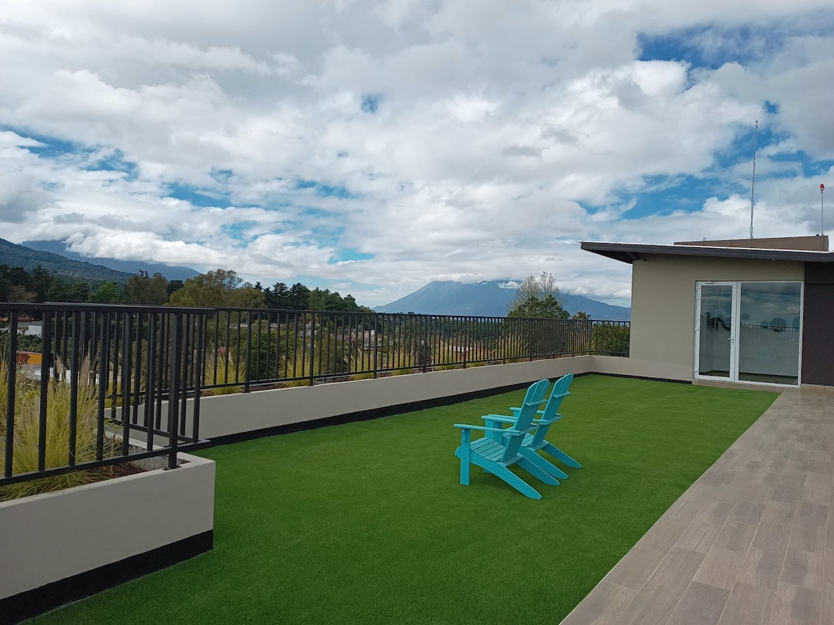 Discover your perfect place to stay, where beauty and peace meets. This apartment offers a complete modern living experience, just 10 minutes away from Antigua Guatemala and 15 minutes away from San Lucas. Surrounded by natural forests and trails for exploration, it features barbecue areas for your grilling, a pool to cool off, and places designed to capture the most breathtaking panoramic views of the volcanoes. Experience peace and adventure, all in one place.