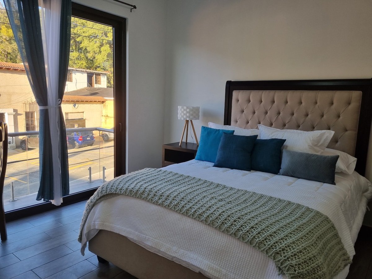 Camina en la hermosa ciudad colonial y crea buenos recuerdos de tu estadía. Disfruta del fácil acceso a tiendas y restaurantes populares desde este encantador lugar para hospedarte. La habitación cuenta con ventanales y vista al volcán. TV con Netflix y ventilador. La ducha y el baño son compartidos.