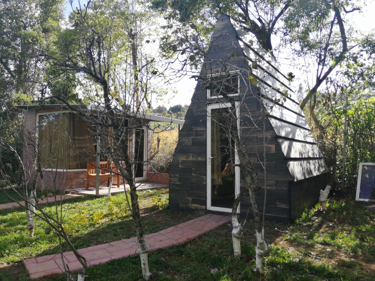 Bonita Cabaña rustica en las faldas del Volcan de Agua, de 1 ambiente grande con cama matrimonial, y mesa de trabajo. Baño y regadera con agua caliente. Es off the grid, sin energia electrica pero con lámparas solares. Ubicada a 10 minutos del centro de Antigua en vehiculo. Tiene increíble vista hacia Antigua Guatemala, Volcan de Fuego y Volcan Acatenango. Hay churrasquera, hamacas, jardín grande cerrado y área para acampar. Es un lugar seguro, hay guardián.