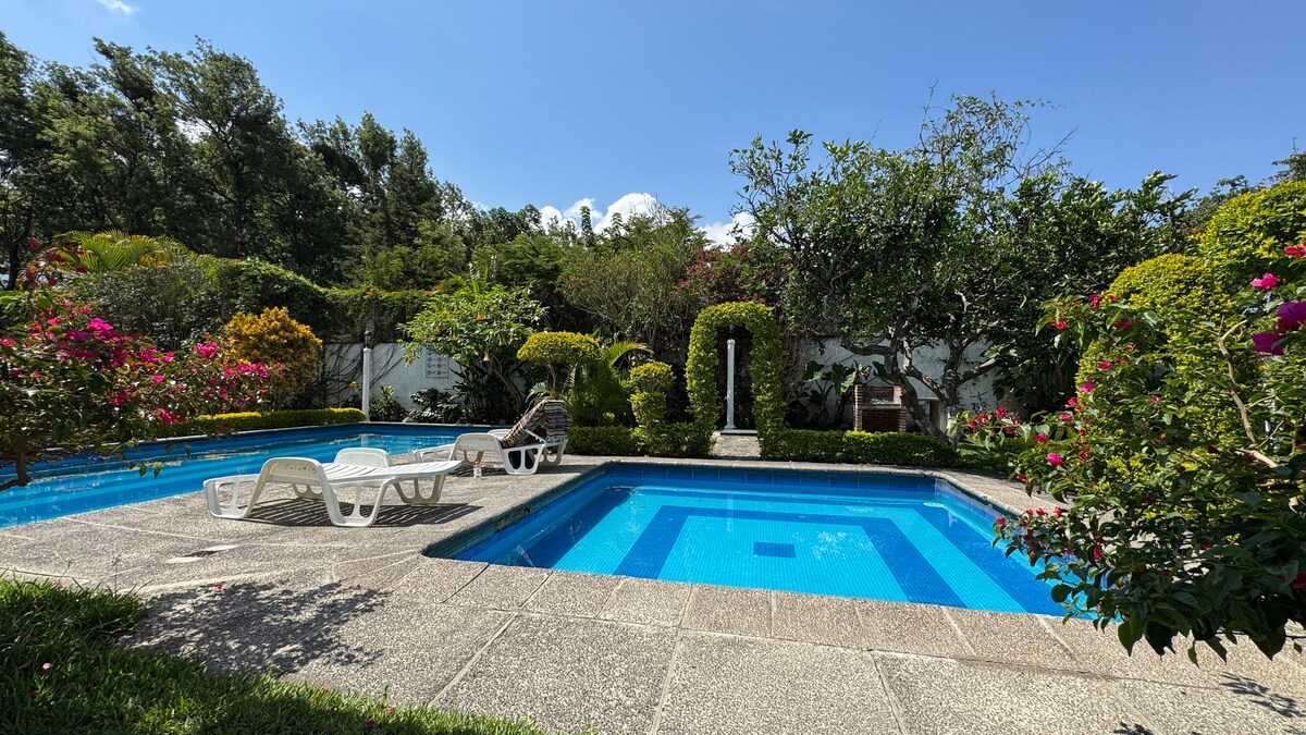 This serene and tranquil place to stay is perfect for weekend getaways, girl's trips, service trips, studying spanish, and just all around vacaiton. The home features gorgeous volcano views, a peaceful patio, stylish furniture, goeverything is brand new. Room for 4 people to each have their own bed or up to 6 people. Walking distance to nice restaurants, bank, salon, pharmacy, and Super24. Free parking in front. Gated and gaurded neighborhood with gym,clubhouse, and gardens.
