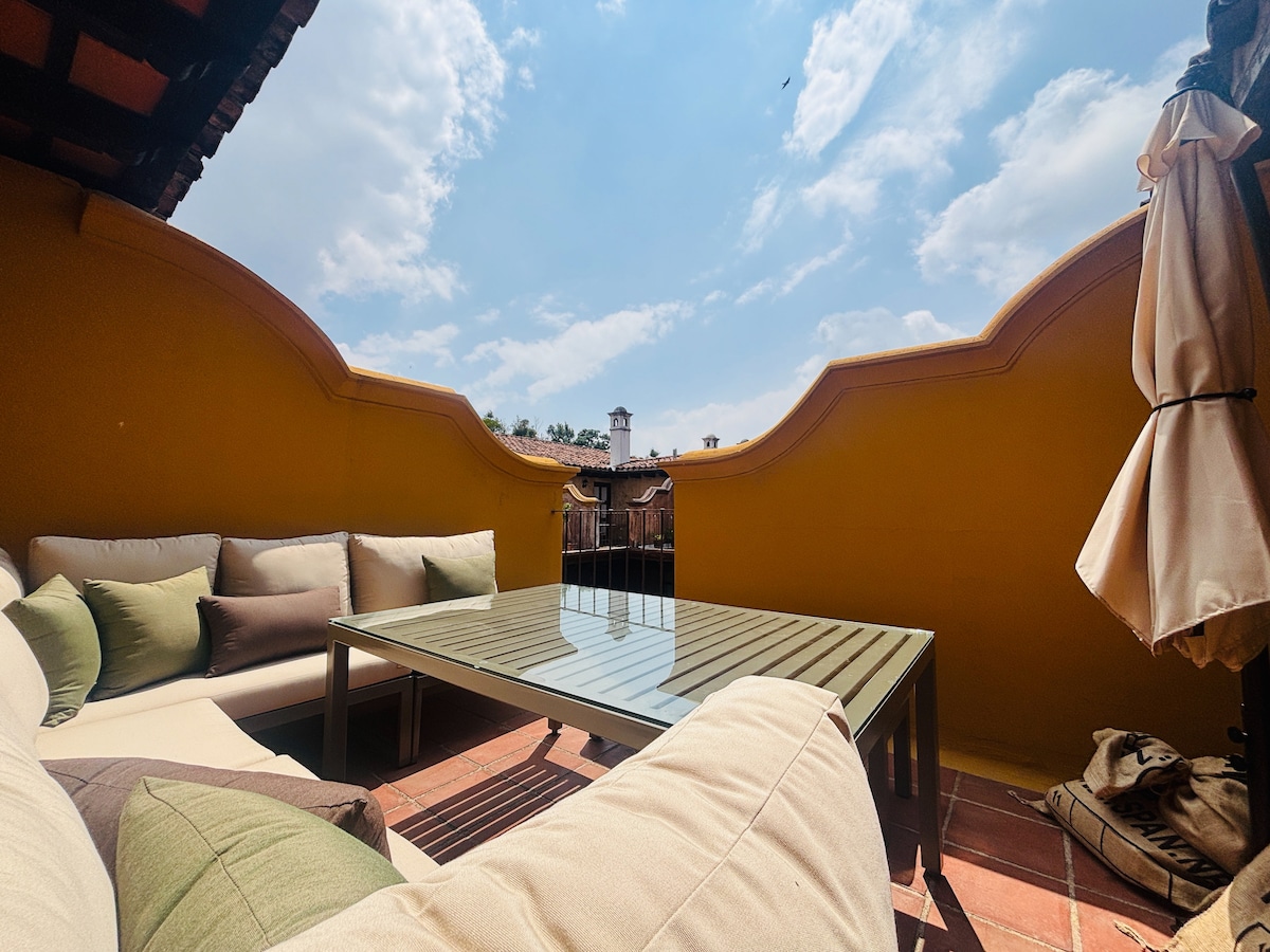 Un lugar increíble, tranquilo y seguro para descansar, y al mismo tiempo disfrutar de la magia de Antigua. El Loft está decorado al estilo colonial antigüeño con hermosos detalles elaborados a mano por artesanos locales, que hacen de la decoración y arquitectura un espacio único en su clase. Está ubicado en una antigua finca de café, que actualmente es un complejo privado. Situado a 2 minutos del casco antiguo y a 5 minutos del parque central.
