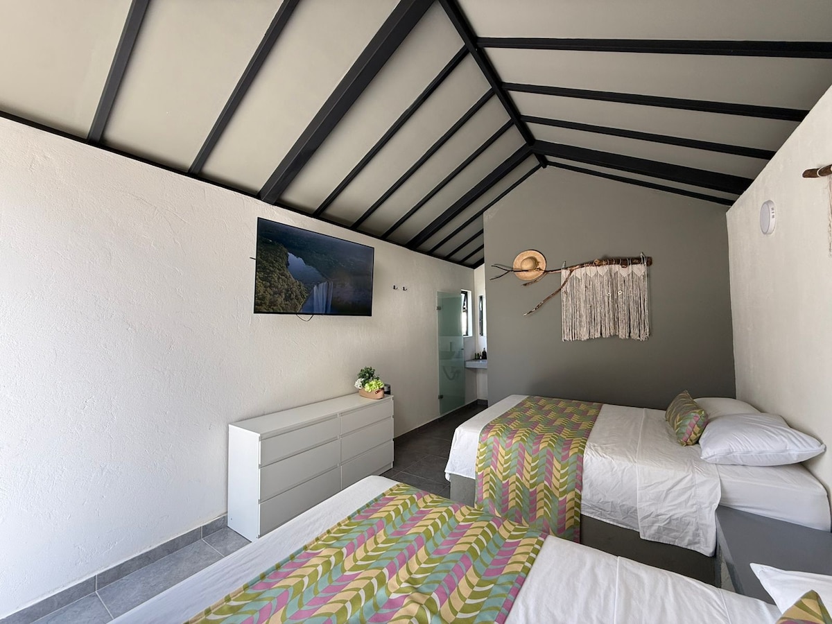 Habitación Doble + Twin – amplia, luminosa y con estilo colonial renovado. Baño privado y área de 15 m² + baño de 2 m². Ideal para familias, parejas, y nómadas digitales que buscan comodidad y conexión cultural: Zona coworking con internet de alta velocidad. Patio interior con vegetación, sala de TV, comedor compartido y cocina equipada. Desayuno cada mañana. Vive una experiencia fresca, natural y silenciosa en pleno corazón turístico de Medellín, a pasos de metro, restaurantes y bares.