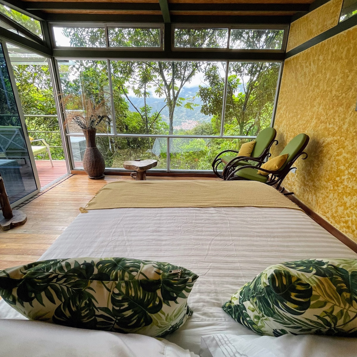 Charming Treehouse | Jacuzzi-Lake Views Reconnect with nature in our inviting 2-bedroom Treehouse at Atma Villas, Guatapé. Elevated with breathtaking views of El Peñol Reservoir, this distinctive getaway offers a queen bed, two twin beds, two bathrooms, an outdoor jacuzzi, and a private terrace. Savor a Nespresso coffee, unwind by the firepit, or catch up on work at the desk. A welcome amenity and à la carte breakfast are included. Ideal for families or friends.