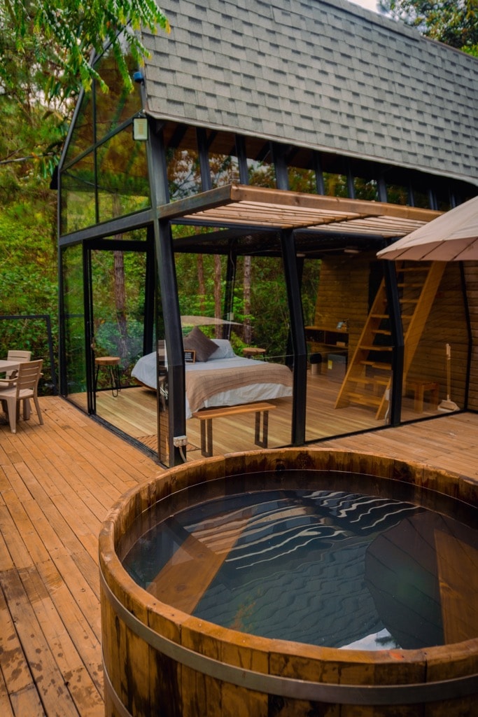 Experience the ultimate blend of nature and relaxing in our Glamping Tent. Safari Villa This enchanting yet elegant space features a private deck, perfect for relaxation. Start your morning with a delicious à la carte breakfast and unwind in a spacious jacuzzi after a day of thrilling adventures. The tent also includes a Nespresso machine and a special welcome amenity to make you feel right at home.