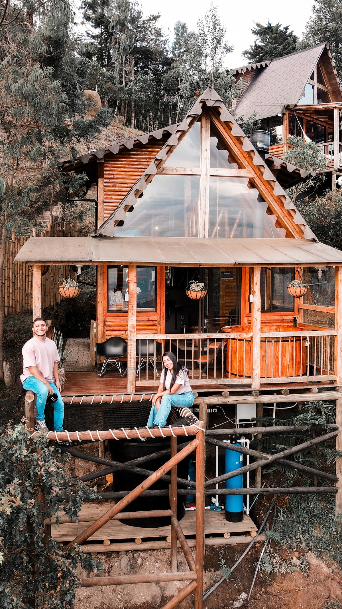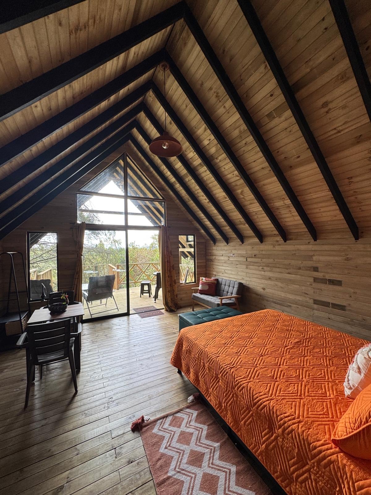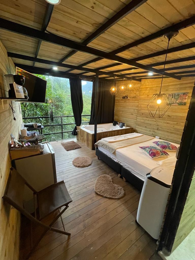 Rainforest Refuge Chalet in Guarne, Antioquia, Medellín, surrounded by majestic mountains and the soothing sounds of birds and butterflies. Enjoy breathtaking sunrises and reconnect with nature from our cozy cabin's spacious deck, where you can sip coffee and take in stunning views. Inside, a glass-ceiling bathroom invites you to unwind while the fully-equipped kitchenette enhances your stay. With outdoor furniture for al fresco dining and serene paths to explore, you’ll feel in heaven!