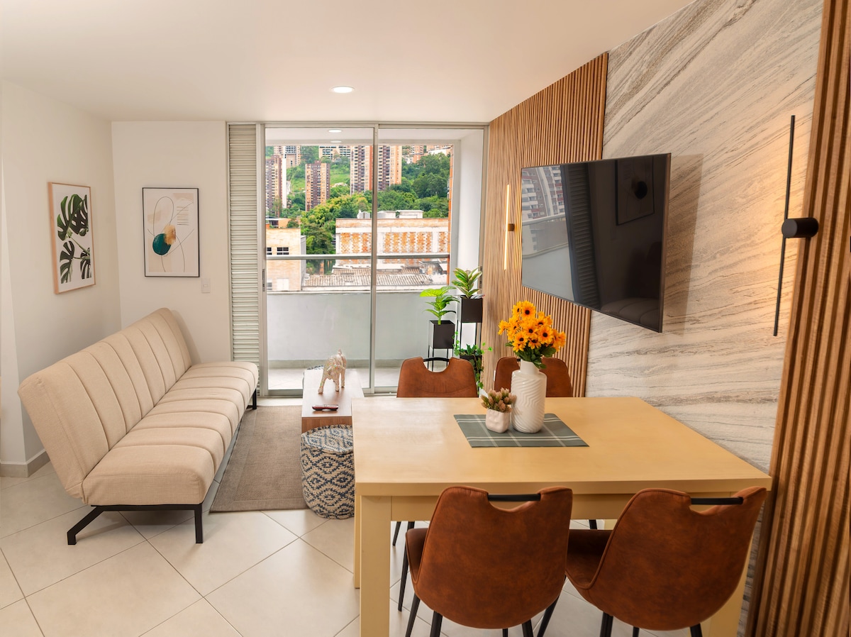 Moderno apartamento automatizado con habitación independiente, sala de estar y cocina, completamente amueblado, 500MB de internet, aire acondicionado y espectacular vista a la ciudad. El edificio está ubicado en el mejor barrio de Medellín, El Poblado, cerca de la Universidad EAFIT, la Milla de Oro, centros comerciales, supermercados, restaurantes y la estación Aguacatala del metro. Cuenta con zona de coworking, café, gimnasio y vigilancia las 24 horas.