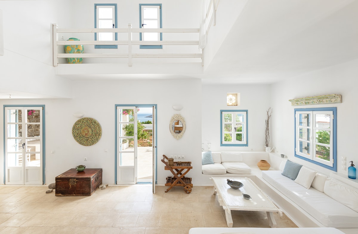 Giacomo Home is an inviting property in a breath-taking location. Built in traditional Cycladic-style it boasts impressive stone clad walls and acres of space. The simplicity of the architectural design and the clean surfaces are a central point of the architectural composition and functionality of the spaces. The houses’ two en-suite bedrooms (Cocomat sleeping eperience) provide you with cool, calm havens which will help soothe you to sleep.