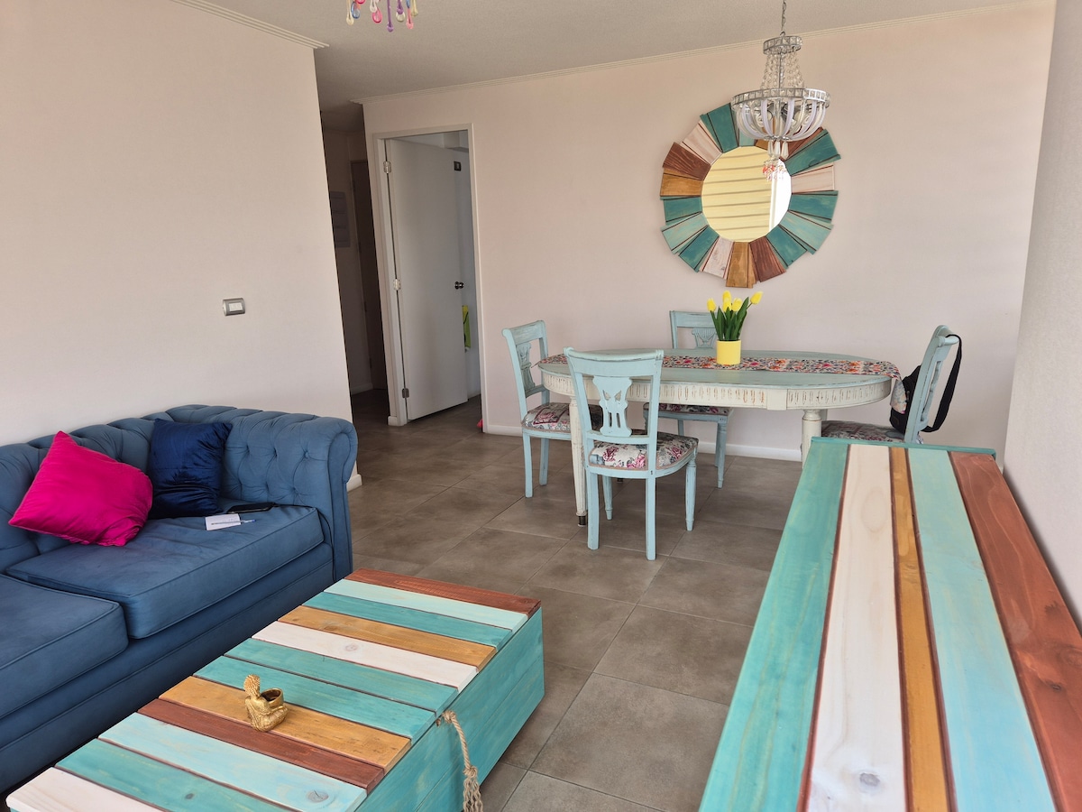 Bienvenido a tu hogar temporal en Antofagasta.Este departamento está ubicado en el sector norte de la ciudad a 10 minutos del aeropuerto, en el cuarto piso de un edificio con ascensor y vista al mar desde el living. Cuenta con: -Un acogedor dormitorio con una cama de 2 plazas. -Un pequeño dormitorio con una cama de 1,5 plaza. -Living con sofa y Tv con cable. -Internet WI-FI. -Cocina equipada con todo lo necesario para cocinar. -Lavadora de ropa disponible. -Estacionamiento privado incluido.