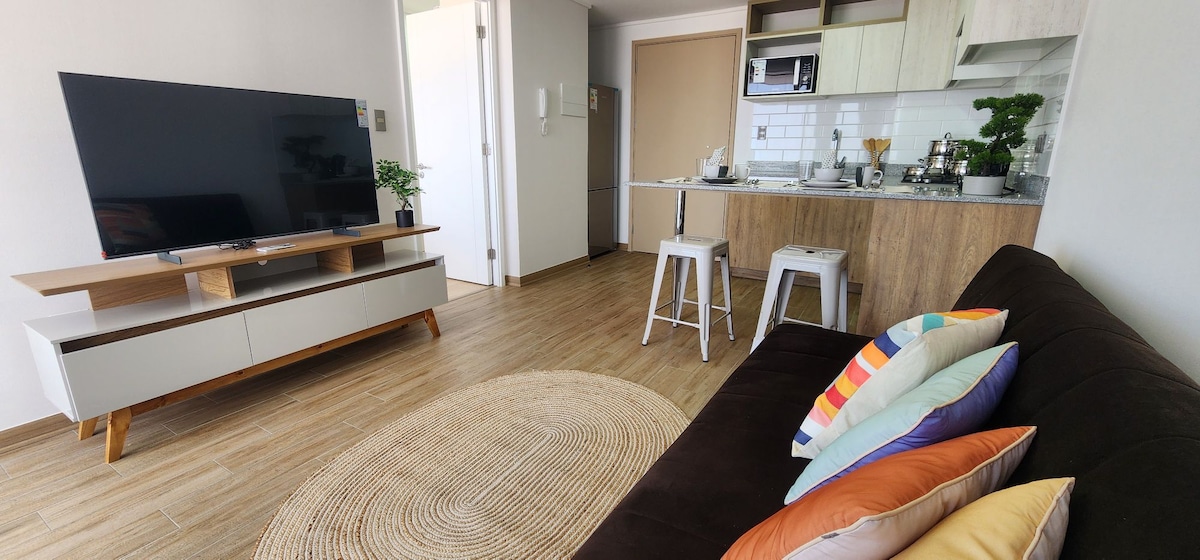 Departamento de un dormitorio, un baño y, un estacionamiento, completamente amoblado, con todo lo necesario para disfrutar de una grata estadía. Consta de una cama de dos plazas (en dormitorio) y un futón en la sala. Consultar de requerir utilizar el futón ya su uso tiene costo adicional por concepto de ropa de cama. Cercano a centros comerciales (Mall), supermercados, parques, áreas verdes, playas, aeropuerto, y otros puntos de interés.