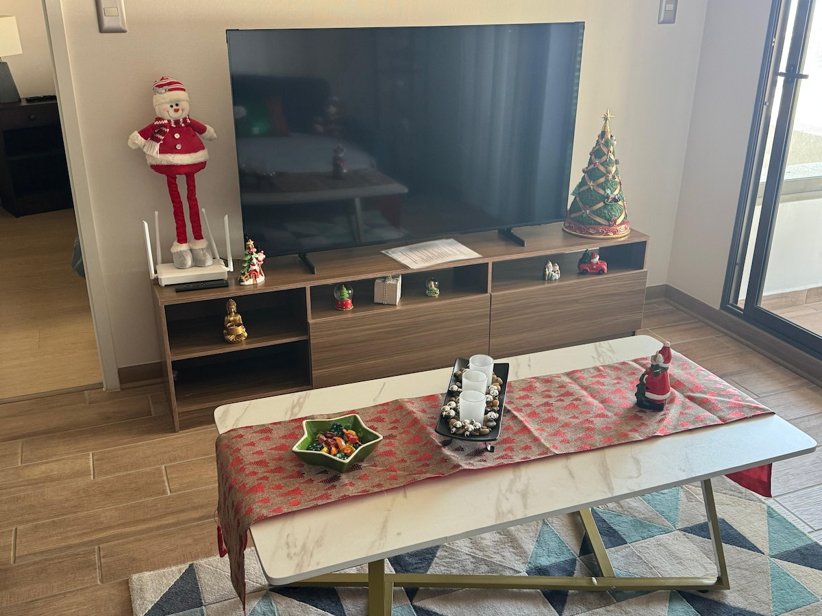 Disfruta de tu estadía en un lindo y acogedor ambiente navideño. Departamento ubicado en sector norte de antofagasta. Relájate en este espacio tan tranquilo y elegante. Departamento de una habitación con cama de dos plaza,televisión, baño en suite, cocina completamente equipada, terraza y estacionamie to incluido . A pocas cuadras del mall la Portada, a sus alrededores se encuentran bencineras, supermercados, farmacias, minimarket y locomoción a la puerta . A 20 min del aeropuerto. Wifi.