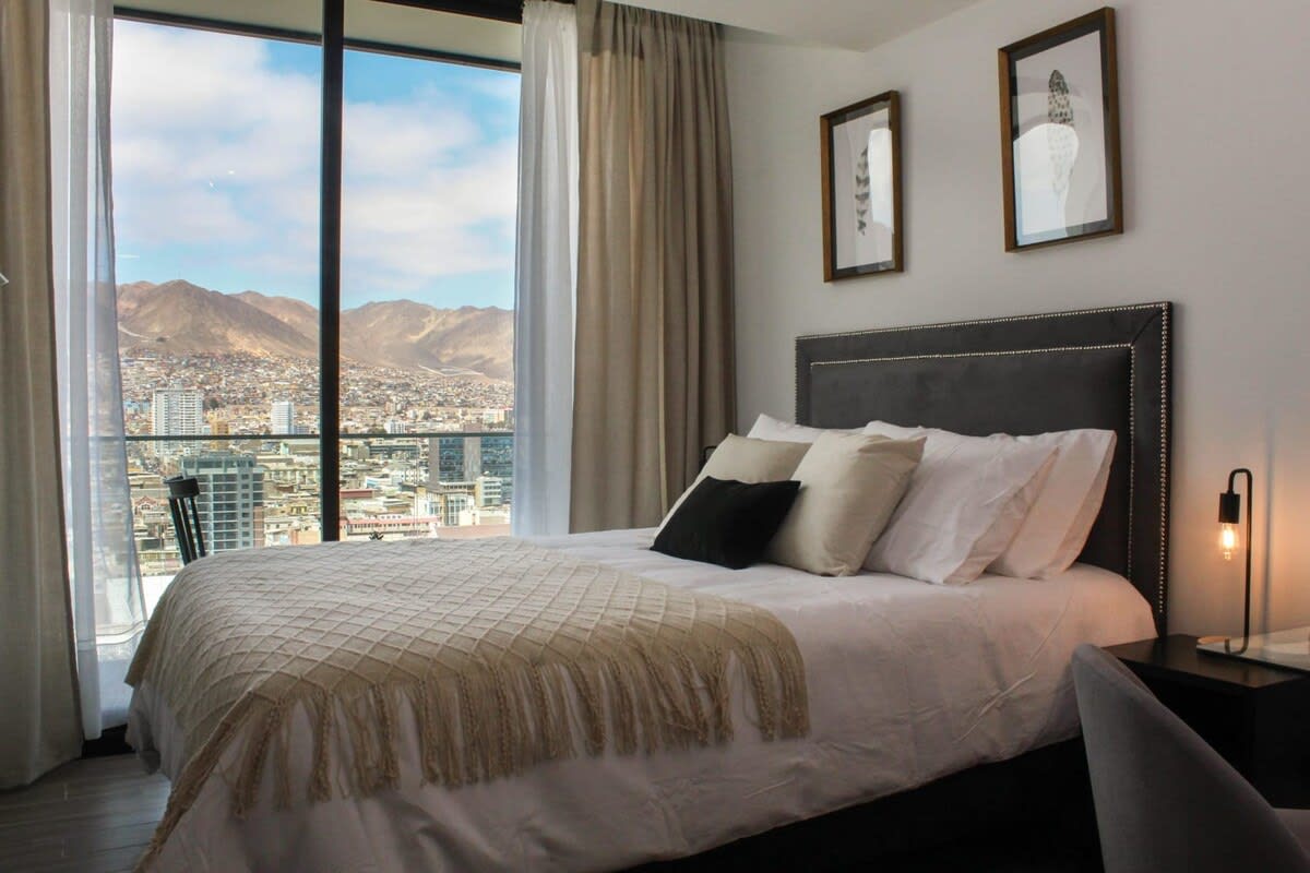 Disfruta de una experiencia con estilo en este alojamiento céntrico con áreas comunes: espacio de trabajo Cowork, gimnasio, lavandería, quinchos, vista 360 de la ciudad de Antofagasta.