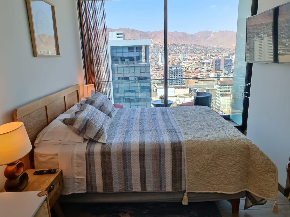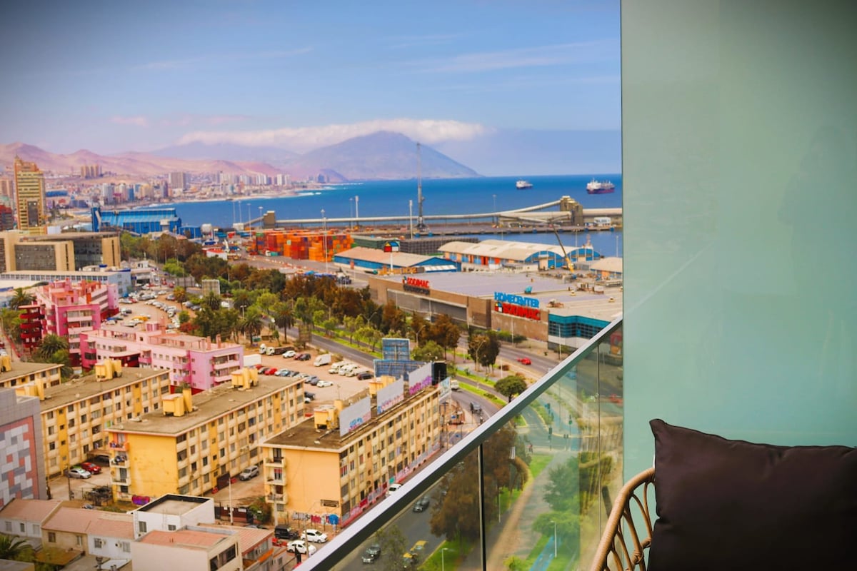 Disfruta de la vista al mar desde este espectacular departamento de 1 dormitorio en el corazón de Antofagasta, junto al Mall de Antofagasta y la costanera. Diseñado para el viajero corporativo y parejas, completamente equipado con una decoración moderna y elegante. Cuenta con ropa de cama y toallas, internet, refrigerador, Smart TV, utensilios de cocina y una terraza full equipada con la mejor vista al mar de Puerto Nuevo. ¡Reserva ahora y vive la experiencia!