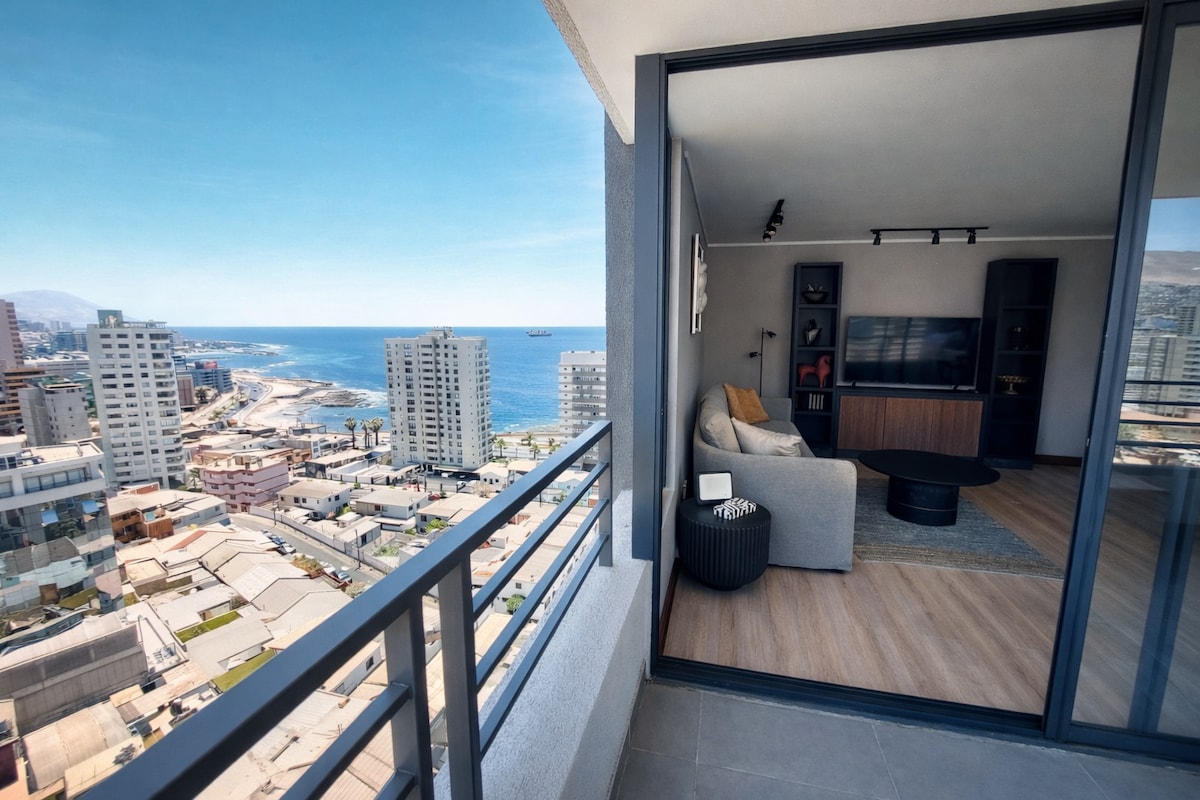 Apartamento de un ambiente ubicado en el mejor sector de Antofagasta, plena costanera centro, a un costado del Mall Antofagasta. Posee terraza panorámica con desayunos y carta de tragos. Decoración elegante y acogedora para disfrutar de unos atardeceres perfectos acostado y disfrutando para descansar como se merece. Conectividad con toda la ciudad. Este apartamento es usado por el dueño cuando esta de viaje en Antofagasta, entonces esta completamente equipado con todo lo que puedan necesitar.