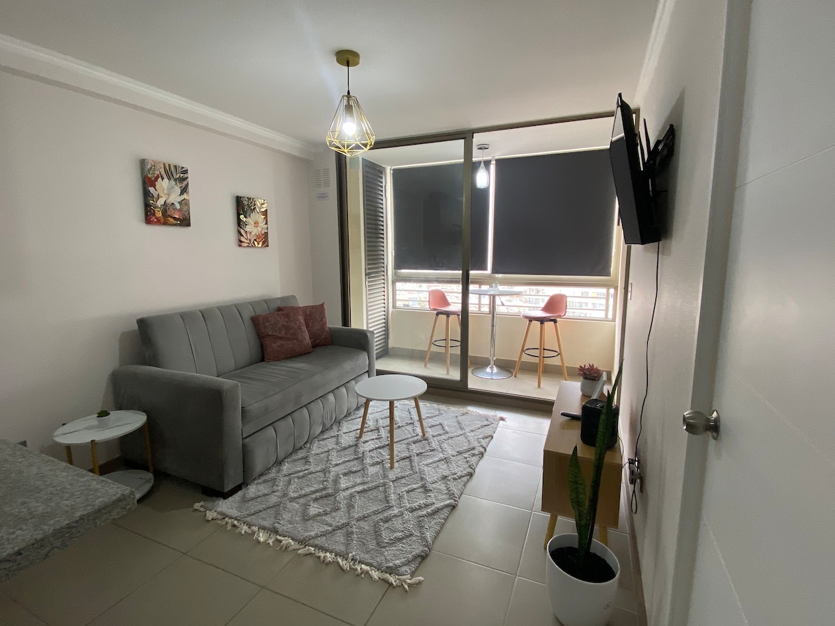 Dpto. Entrada autónoma, vista al mar y parking privado indoor. full amoblado, sector lider express A 10 min del centro. A 2 cuadras a pies de super lider express. A 5 min de la Municipalidad. A 3 min del Hospital Regional. A 3 min del terminal de buses. A 30 min del aeropuerto. Wifi y televisor smart tv de 43”, con Netflix, HBO premium. Cocina full equipada; Hervidor, horno eléctrico, microondas y lavadora secadora sillón reclinable. Silla reposera con vista al mar Conserjería 24 hr
