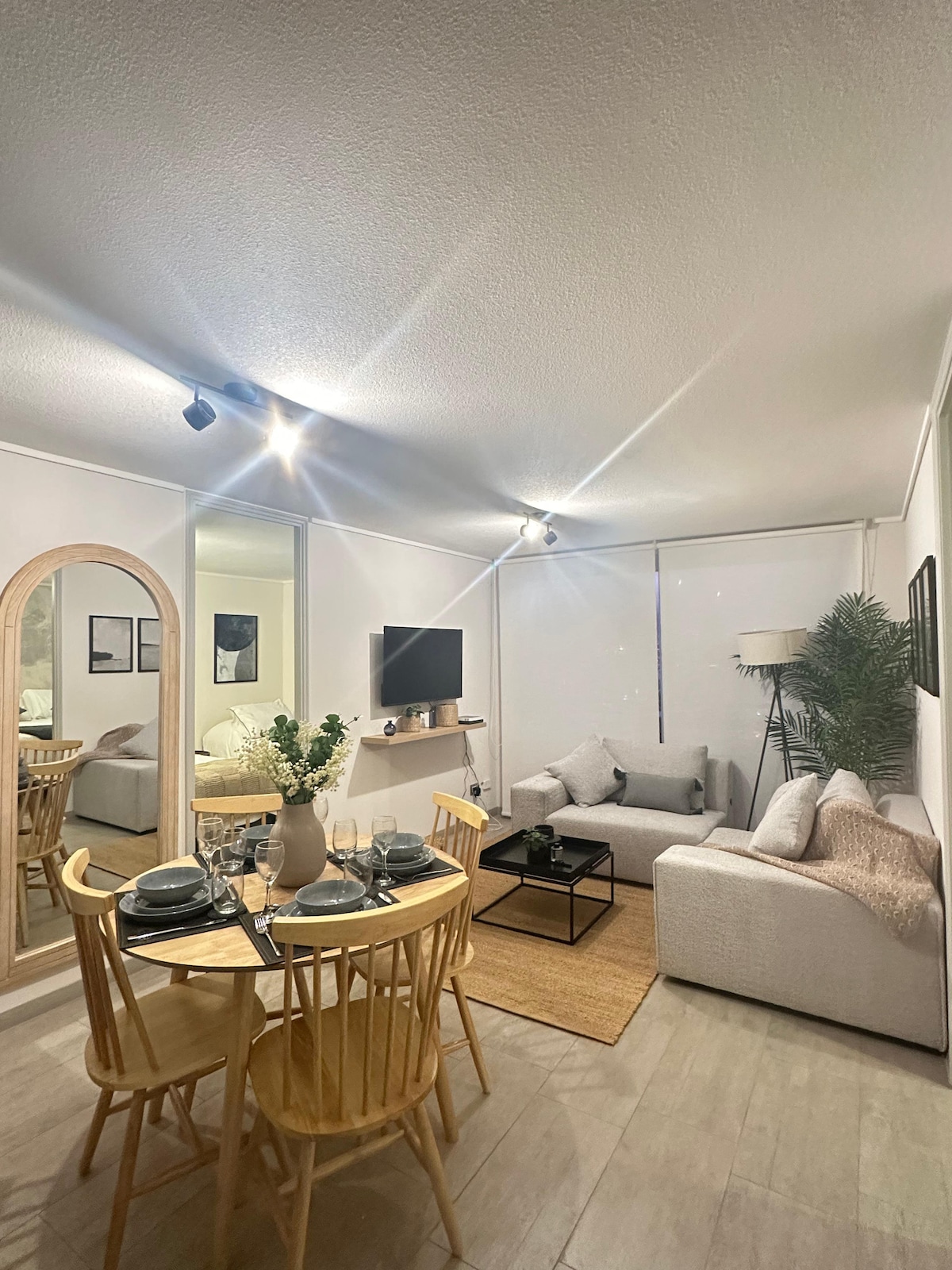 El departamento cuenta con 1 habitación con cama matrimonial y 1 sofá cama en el living de gran comodidad. Cuenta con estacionamiento privado cubierto, internet de alta velocidad, televisión por cable smart tv, cocina completamente equipada, cuenta con amenity como ropa de cama, sabanas y toallas, cuenta con lavadora en el departamento, lo cual lo hace sentirse verdaderamente como en casa. Los esperamos!!