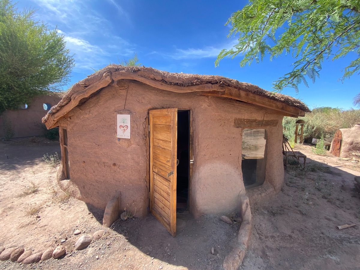 Cabaña hecha con técnica tradicional en barro. Dispone de una cama matrimonial y una individual. Baño privado. Cocina compartida.