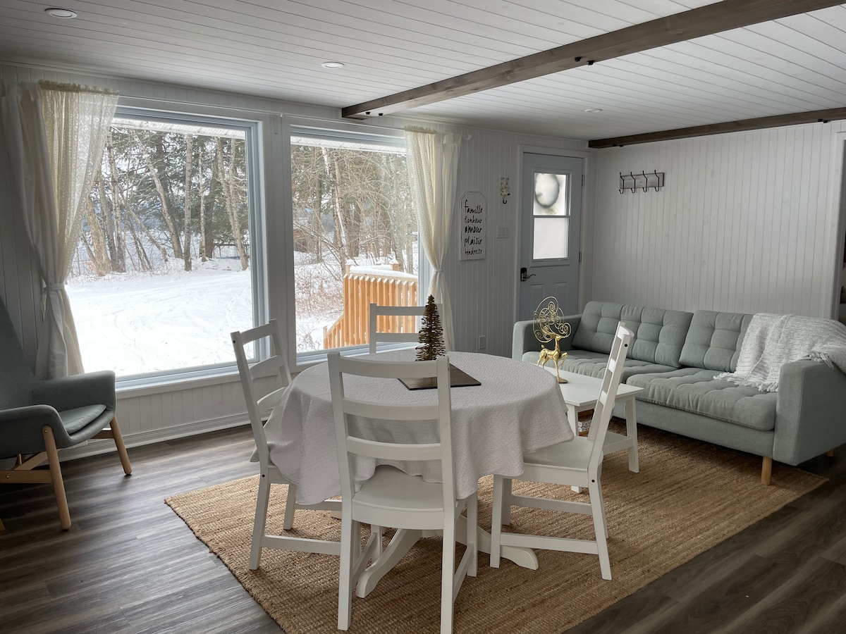 Unwind by a campfire on the quiet bay, relax in the gazebo, or soak up panoramic lake views from inside. This cozy cottage offers fast WiFi, Netflix, games, puzzles, and a record player. Enjoy year-round fun with great fishing, seasonal gear, and direct access to 2,000 km of snowmobile trails. Pet-friendly and full of charm—perfect for both adventure and relaxation. Check us out on insta @CozyBohoLakeHouse CITQ Establishment 303126