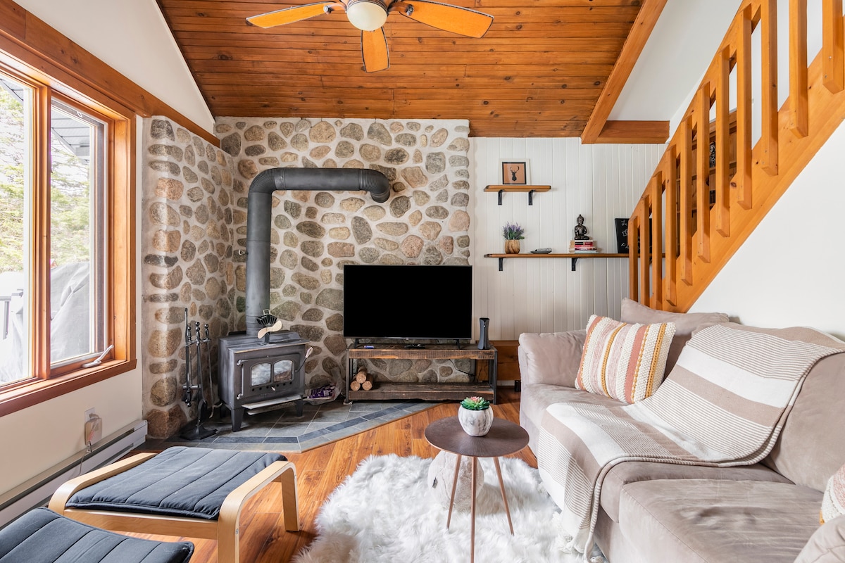 CITQ 300775. ★★★★★ TREMBLANT Central! Enjoy a truly captivating time away from the city at this peaceful vacation home, w WIFI. Relax to the trickling sound of the river. Soak in breathtaking views of water, faun & fauna. Feel miles away yet nestled in your very own cozy chalet, directly in old Mont Tremblant, 0.5 km away from the linear trail. 6 min. to ski resort. On la Diable river, a renowned fly fishing river; regular fishing is also permitted in our area. EVs: Standard outdoor 120 V outlet