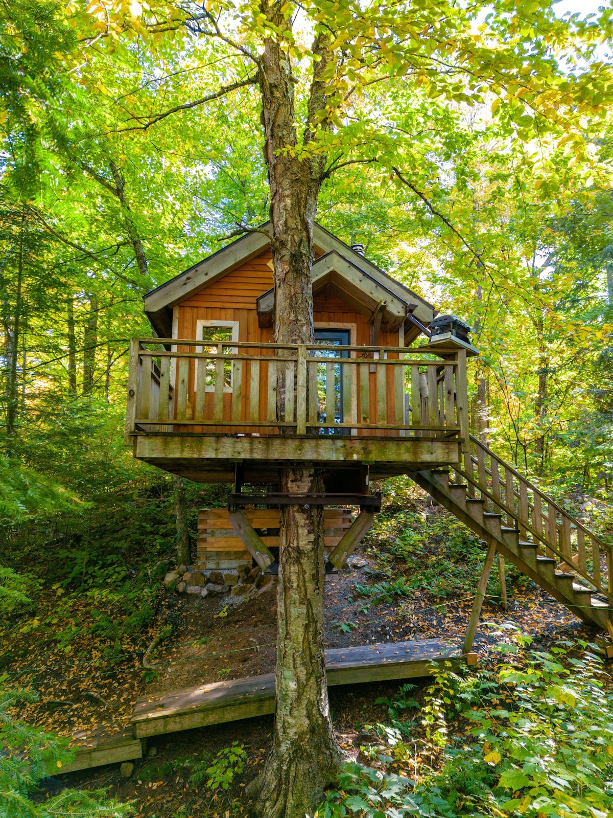 This treehouse is perched between a yellow birch and a maple and has forest views. It is located 60 metres from the lake. It features a 238 sq. foot deck. It sleeps 4 people and is equipped with 1 double and 2 single beds. This treehouse has 1 living area of approximately 19’x9’ sq. feet.