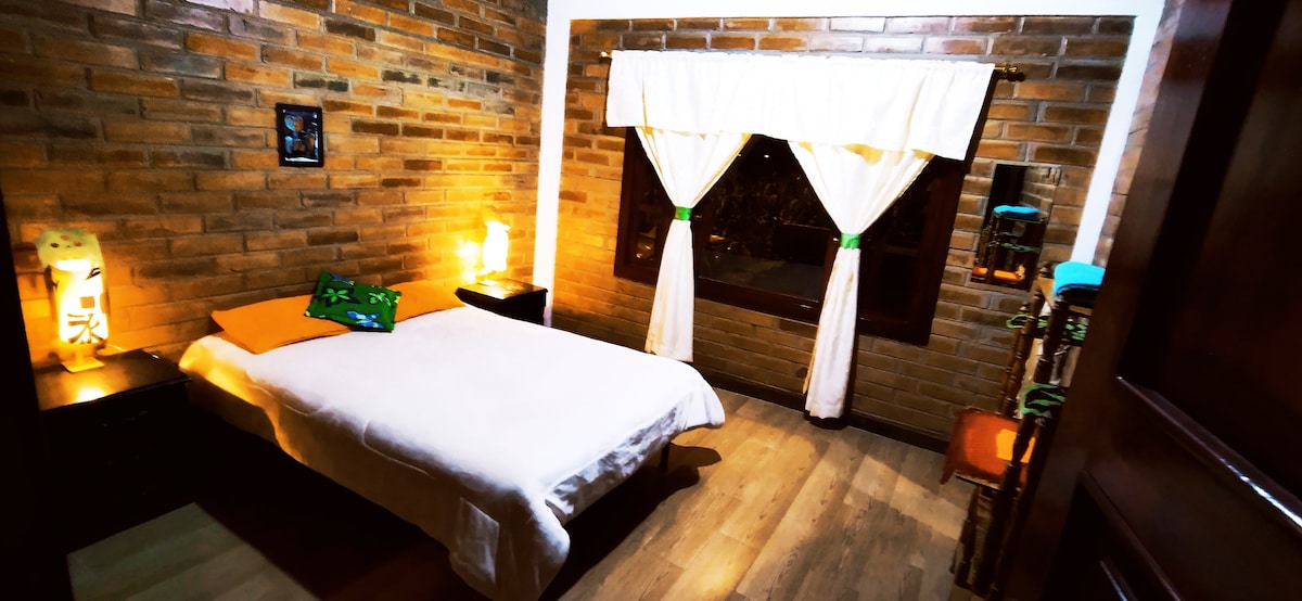 Relájate con toda la familia o grupo de amigos en este tranquilo lugar con un ambiente a naturaleza. Cabaña totalmente privada con un amplio espacio verde para poder recrearse con niños y adultos. Disfruta de nuestros jardines florecidos y llenos de colores tanto en el interior como el exterior de la propiedad - Las habs son muy confortables. - Sala y comedor en ambiente de relajación - Área social con cocina a leña al estilo de campo - Música y zona wifi - Cocina con utensillos necesarios